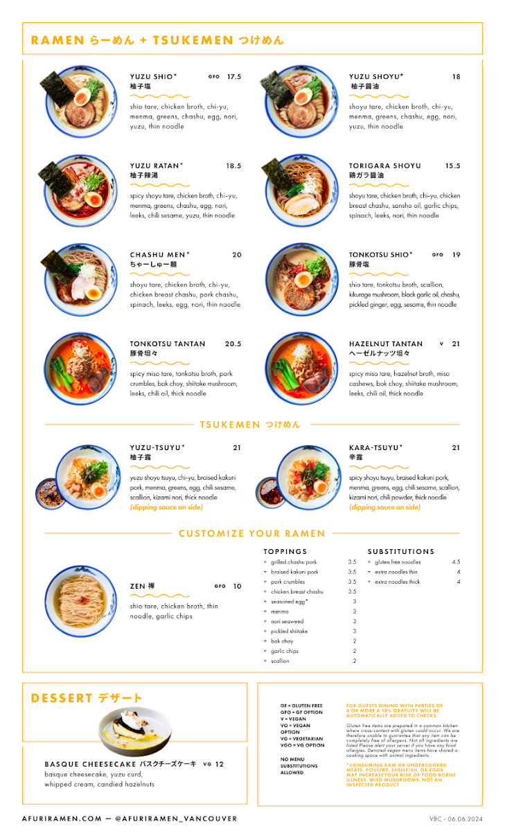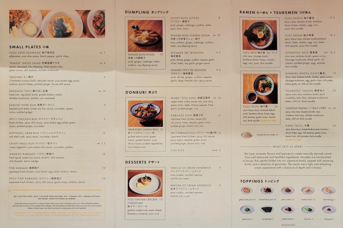 Ordered the daily special which was a chicken yuzu broth. I am not a fan of chicken ramen I prefer pork but this was tender and tasty. The broth is light but flavorful. It was delicious and a very good deal for 13 ramen. The gyoza was OK. I wouldn’t order it again. Staff were friendly and attentive. Lots of street parking nearby.