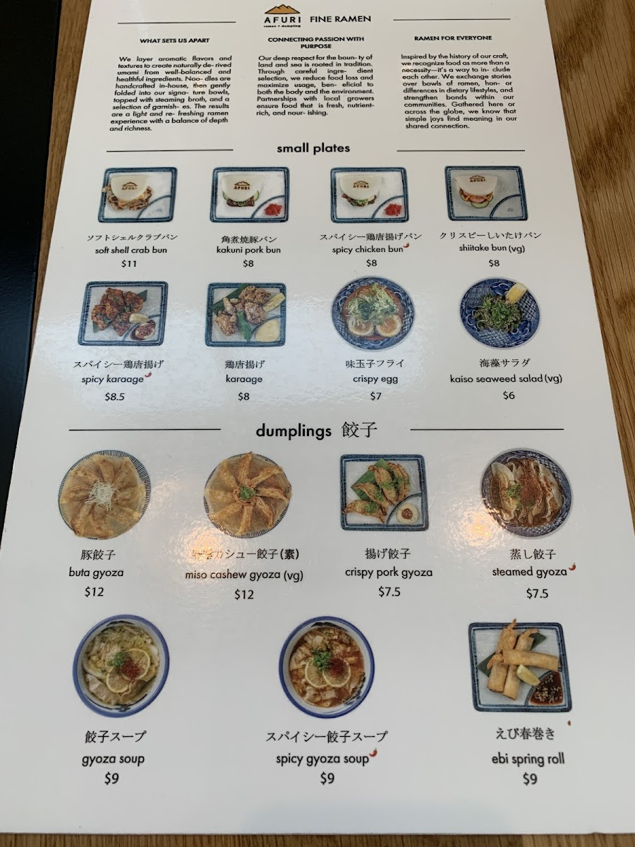 My friend and I stumbled upon Afuri during their happy hour, and we were so glad we did. The house made ginger ale was dynamite, not too sweet with a solid ginger punch. The dumplings were on point, both the steamed and fried varieties, each coming with a unique sauce to accompany. The karrage was solid, but the yuzu kosho egg salad as the sauce might have changed my life. The tostada was unexpected and delicious.